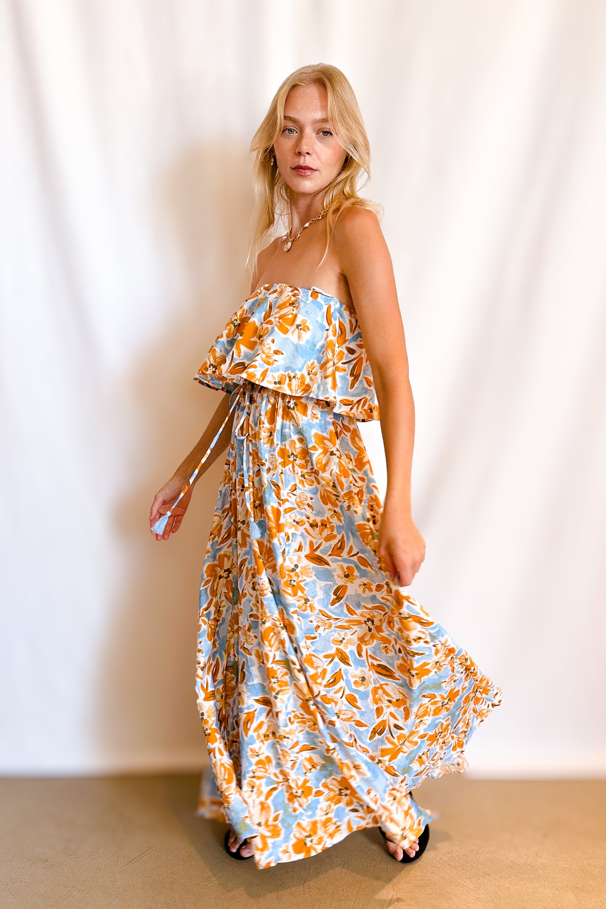 Another great selling style of ours is this pull on strapless maxi dress now available in a happy golden floral print. Dress has elastic at the bust and waist. Ruffle top is flattering & it comes with a thin waist tie that's adorned with tassels at the end of the ties. Slit on one side of the skirt portion adds a feminine touch.