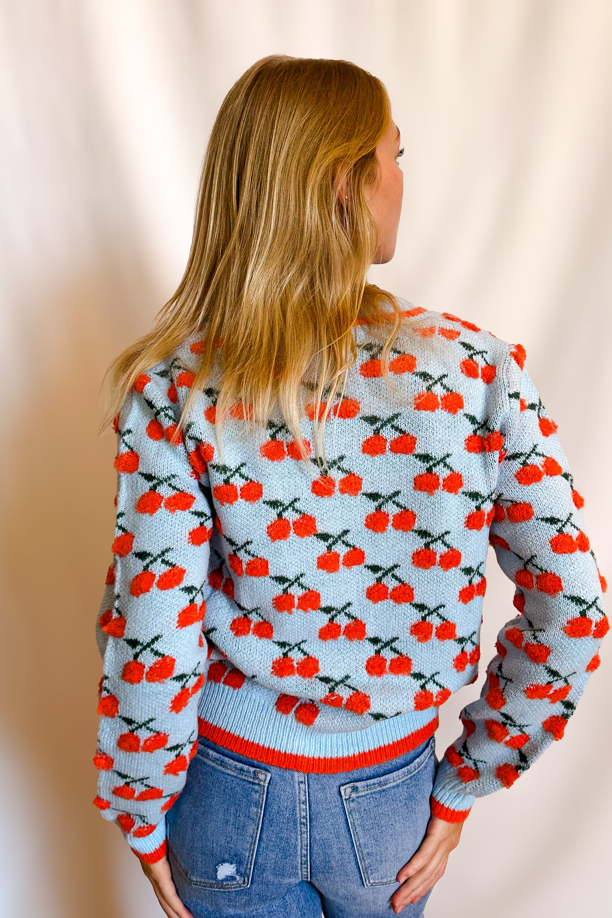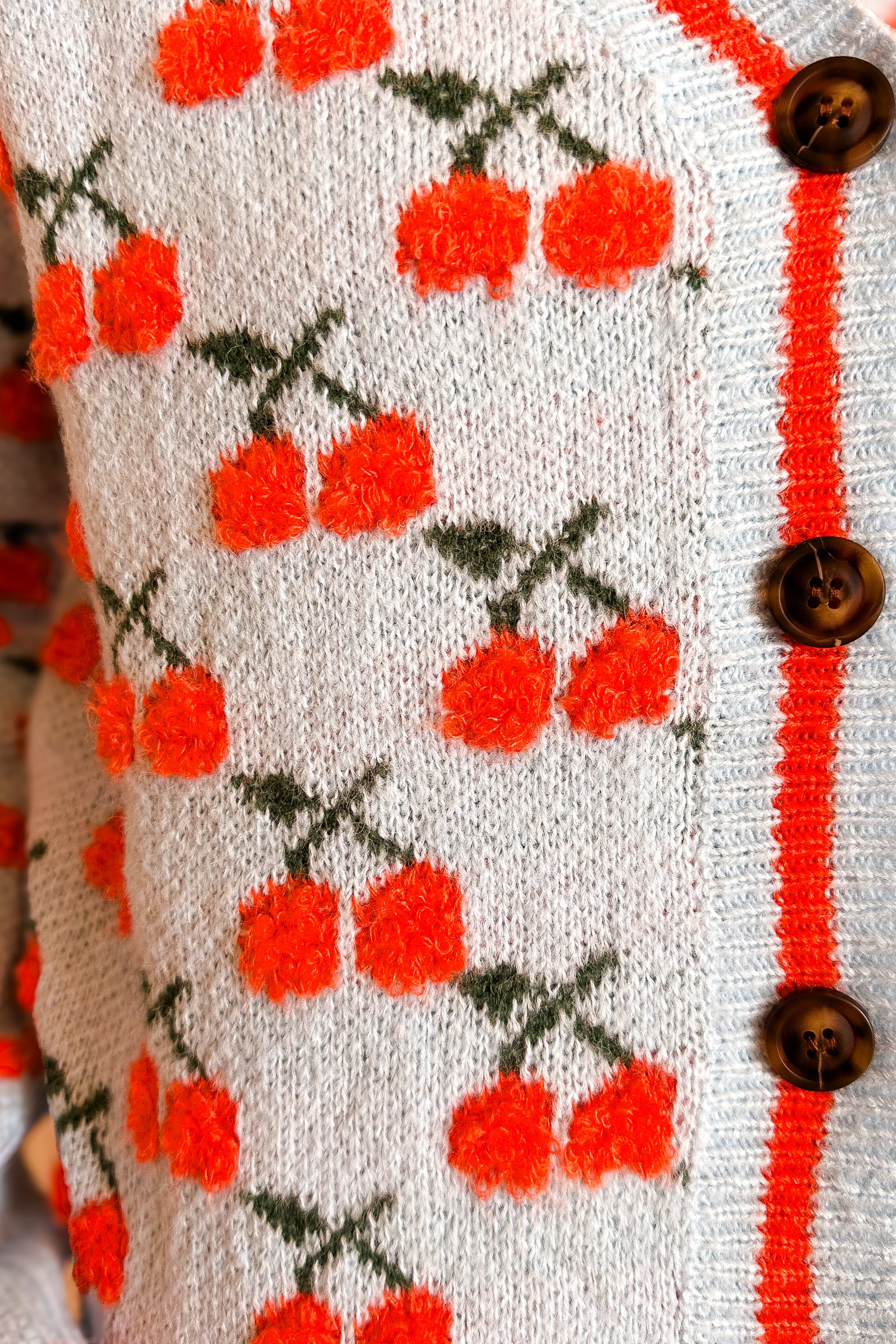 Everyone needs a happy sweater. This colorful cherry knit cardigan is fun, soft & colorful. V-Neck makes it a very wearable sweater year round.