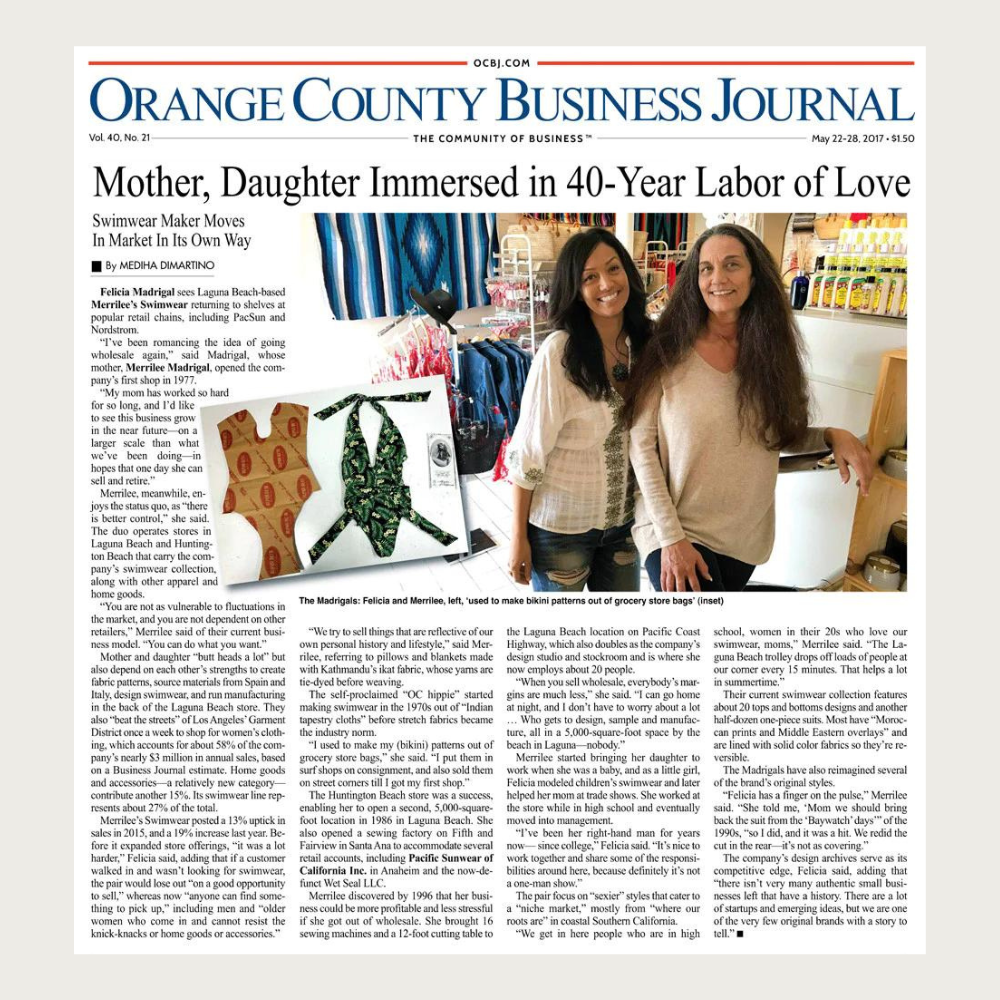 Merrilee’s Swimwear has always been famous for their swimwear line which is designed by the mother/daughter team of Merrilee and Felicia Madrigal. Our swimwear is designed and handmade in Laguna Beach, CA and sold exclusively at Merrilee’s Swimwear Boutique stores. We take pride in making high-quality, fashion-forward designer suits at affordable prices. Merrilee has proven herself to be a dominant design force behind swimwear trends across the world with countless top notch designers shopping her store to see what's new and hot. Many designers have tried to replicate her style and designs over the years but no one has managed to parallel her ability to continually out do the previous year and reinvent the way swimwear is worn year after year. Having made swimwear for over 40 years now, It’s not uncommon to find households with a grandmother, a mother and a daughter who have all owned and loved a Merrilee’s swimsuit of their own.